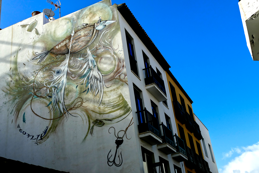 Although painted in a hyper-realistic fashion, his pieces often include dreamy and fictitious segments. Being a renowned street artist, basically around the globe, Martin Ron contributed a lovely piece to Puerto de la Cruz’s murals – paying tribute to its people.